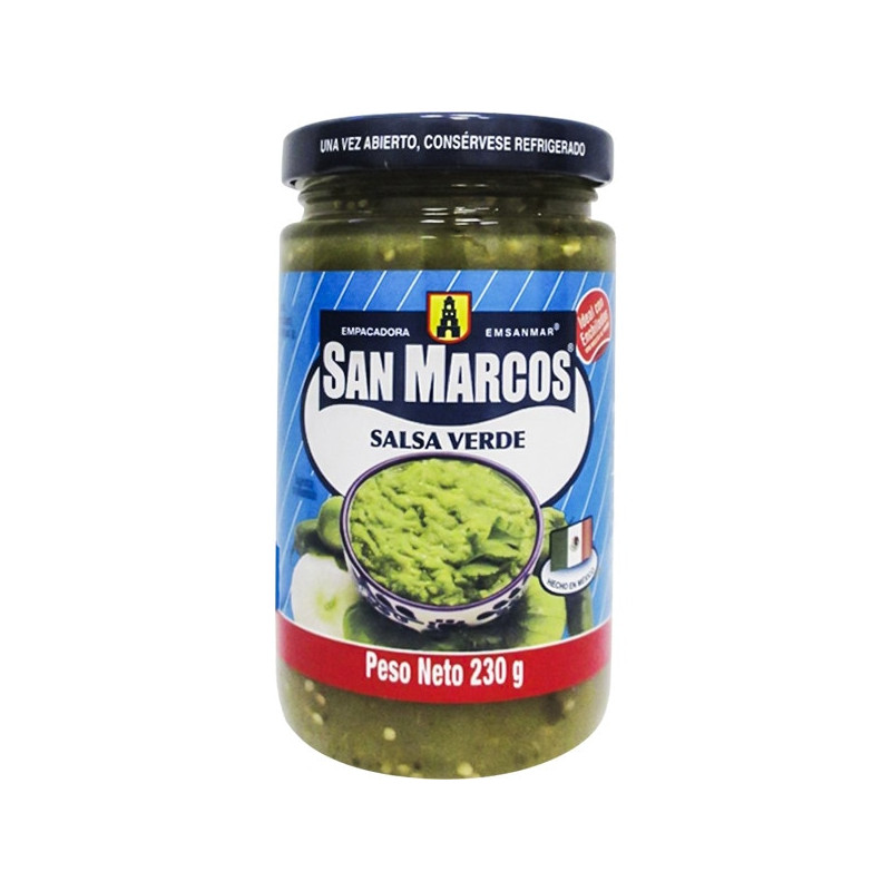 Bright, tangy, and bursting with authentic Mexican flavor, San Marcos Salsa Verde is crafted from ripe tomatillos, jalapeño peppers, onions, and spices. This 230g jar delivers a fresh, zesty heat that’s perfect for tacos, quesadillas, grilled meats, eggs, and more. Its smooth texture and balanced flavor make it a versatile addition to any dish, bringing a taste of Mexico to your table.